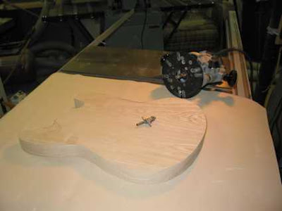 Traced pattern on blank is sawn out on a band saw. The cut is made outside the lines then carefully sanded to the exact dimension, Here the body is sawn out prior to routing out the hardware cavities and electronics bays. Although this method can yield excellent results, it may be preferable to route out the body cavities prior to cutting as the extra wood serves as a "table" on which the router bass plate can ride with greater stability.